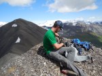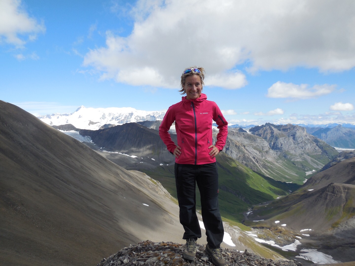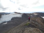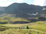 Our camp stayed at the beautiful mountain lake and we hiked up to three of the surrounding peaks. There are so many of them, most of them don’t even have names. From peak 2 and 3 (6750 ft), we saw Mount Blackburn (16390 ft), the snowcovered mountain overarching the others. A kind of Mont Blanc of the Wrangells, although I belive there are many more. We stayed on peak 3 a fair while, but Mount Blackburn was never quite cloud free. Those mountains seem to generate or attract clouds.